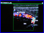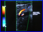- at the level of the belly-button, the aorta splits to pelvic arteries, which continue to leg arteries (inguinal, thigh, popliteal and below-knee as well as foot arteries)